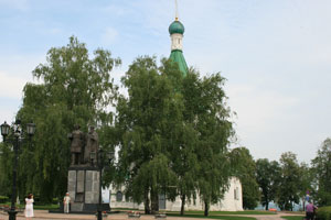 In der Mitte des Kremlgeländes steht die Erzengel-Michael-Kathedrale, davor das Denkmal des Stadtgründers Gleb Wsewolodowitsch und seines Lehrers Simon. |